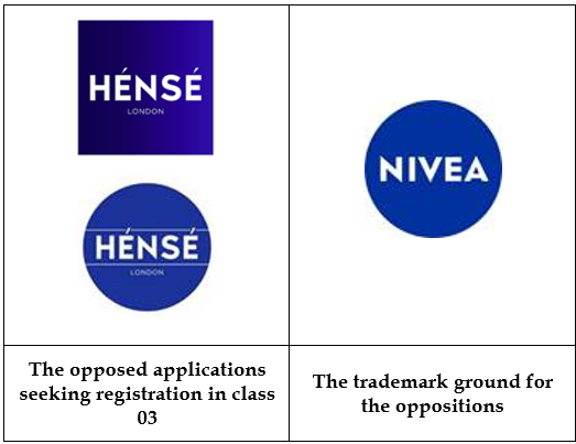 As known, “NIVEA” is one of the worldwide well-known trademarks in cosmetic industry and the blue-white combination within a circle device have become instantly recognizable across generations of consumers. On the other hand, the applications at issue, include “HENSE” phrase in bold and “LONDON” phrase in smaller font, white on both blue circular and square backgrounds. It may be though that “HENSE” is the essential element in these applications and as it is not similar to “NIVEA”, there will be no likelihood of confusion. However, despite the differences between the trademarks regarding their word elements, the overall impression became a game changer in these matters.